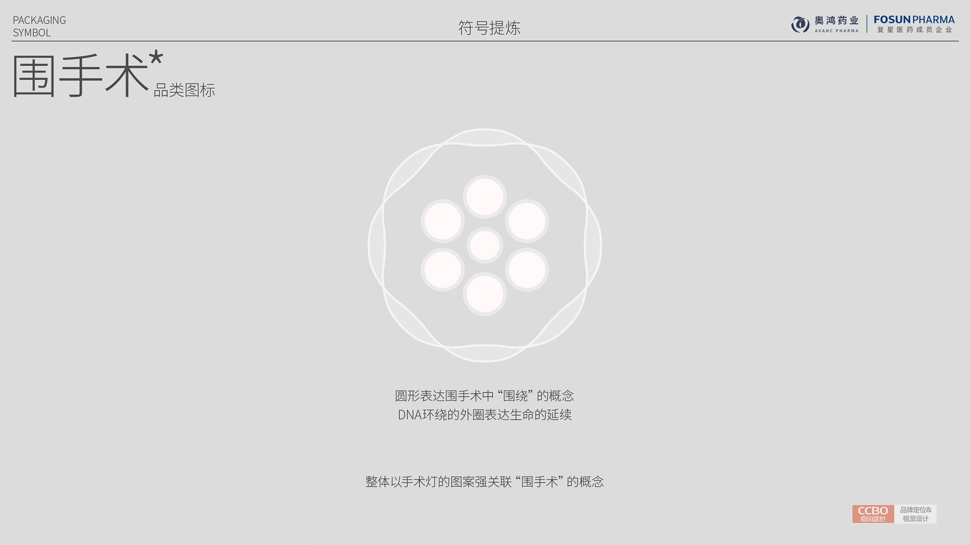 包裝清晰明了的突出產(chǎn)品的特性,具有圖像識(shí)別與認(rèn)知功能,以區(qū)別其他同類(lèi)品牌,提升企業(yè)的品牌形象。其中圍手術(shù)品類(lèi)圖標(biāo),圓形表達(dá)圍手術(shù)中“圍繞”的概念,DNA環(huán)繞的外圈表達(dá)生命的延續(xù),整體以手術(shù)燈的圖案強(qiáng)關(guān)聯(lián)“圍手術(shù)”的概念。