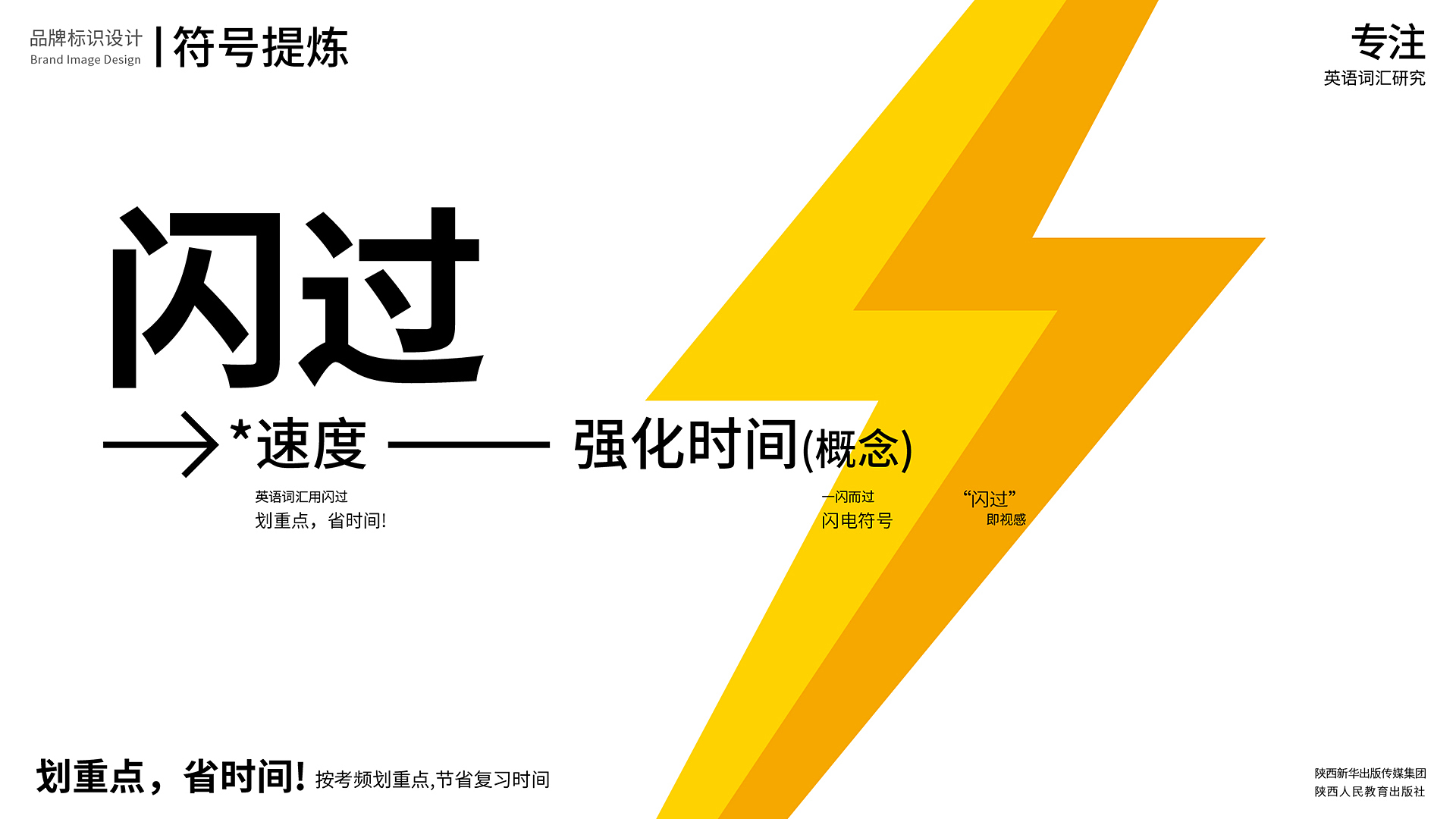 如閃過英語輔教課本,備考詞匯,閃速通過。品牌價值定位:劃重點,省時間,通過閃過節省復習時間,并提高分數;符號:閃電符號;品牌名稱取名為:閃過。符號=名稱=定位,極大的降低了識別成本,記憶成本,認知成本。